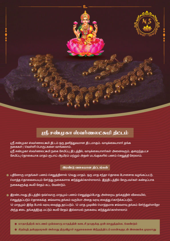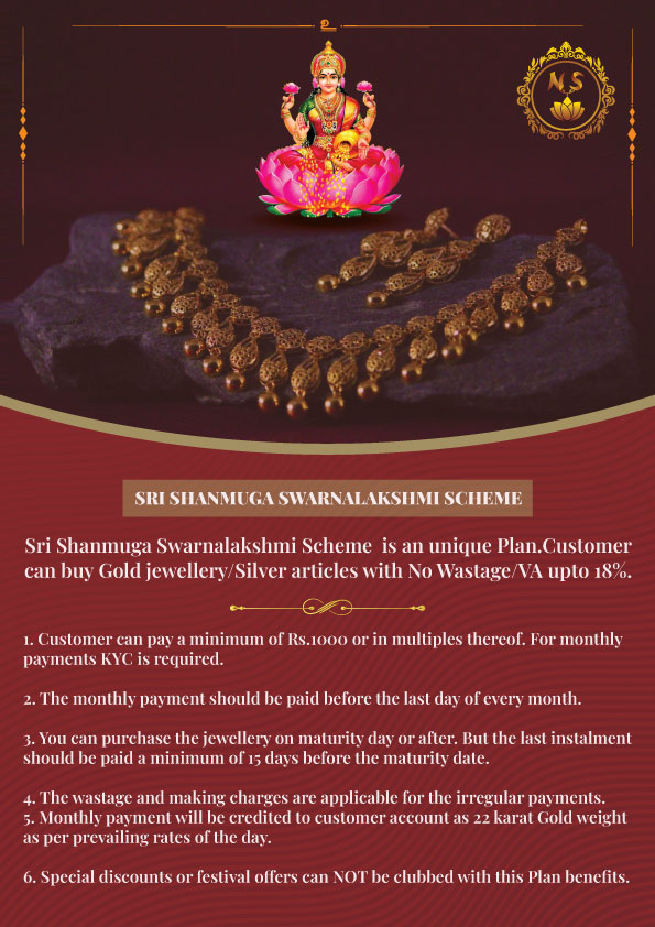 Your Ticket To a Secure FutureStart saving today with Sri Shanmuga Swarnalakshmi Scheme Starting from Rs 1000 Shop Now Sri Shanmuga Jewellery ஸ்ரீ சண்முகா ஸ்வர்ணலட்சுமி திட்டம் Sri Shanmuga Swarnalakshmi Scheme